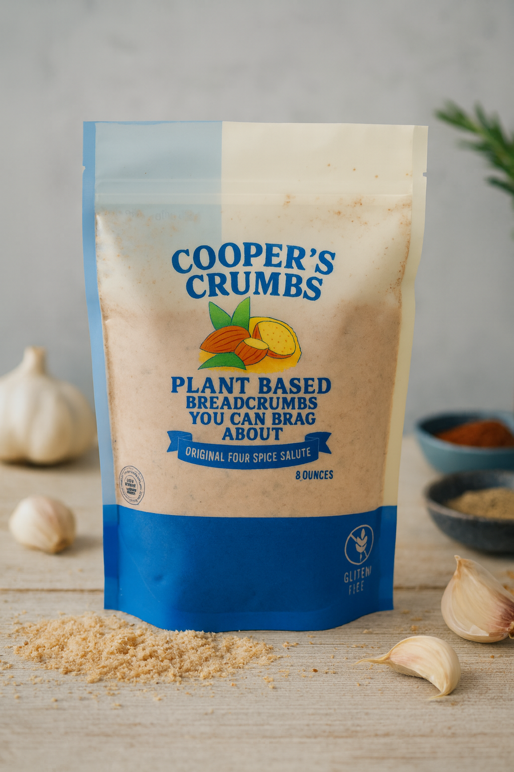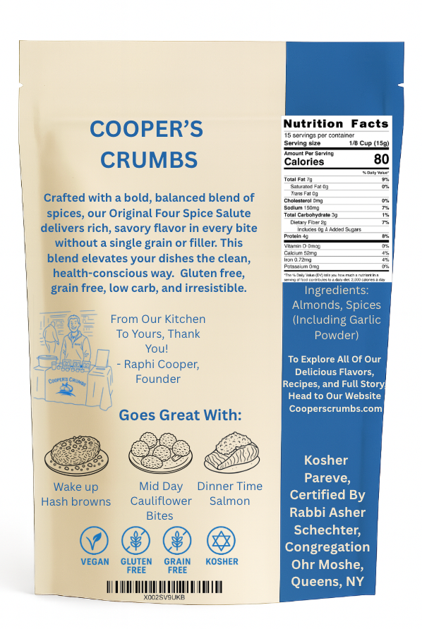 Cooper’s Crumbs Original Four Spice Salute. This clean, mild, and delicious gluten-free breadcrumb mix is the perfect way to keep your meals healthy without compromising crunch or flavor.